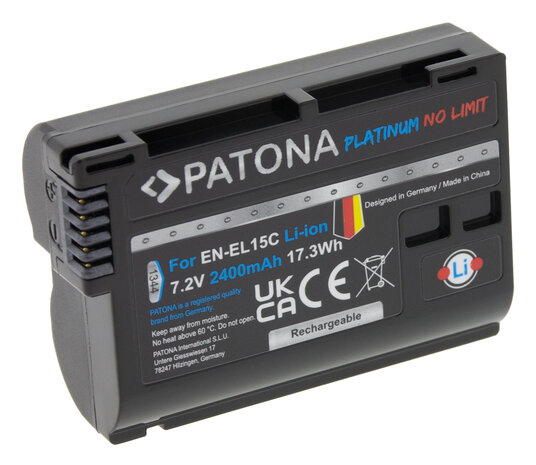 Accu voor de Nikon Z f - Batterij type: EN-EL15 / ENEL15 - 2400 mAh Camera batterij Deze accu kan worden gebruikt als vervanging van uw huidige accu of als extra (reserve) accu voor onderweg. Veiligheid De accu is voorzien van een CE markering en is goedgekeurd voor de Europese markt. Deze accu is beveiligd tegen overbelasting & oververhitting en is zonder problemen te gebruiken met uw huidige toestel en oplader. Merk Deze hoogwaardige Li-ion accu is geen originele accu, maar van het Europese merk Patona.