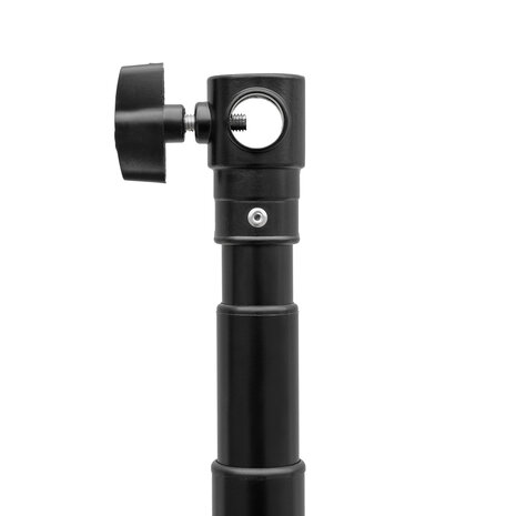 Complete Achtergrondset Deze veelzijdige achtergrondhouder bestaat uit drie onderdelen: twee verstelbare lampstatieven en een crossbar. De set is ideaal voor het bevestigen van achtergrondmaterialen en biedt flexibiliteit voor diverse opstellingen in de studio of op locatie. Lampstatief De set bevat twee aluminium statieven die in hoogte verstelbaar zijn van 1 tot 2,4 meter. Hierdoor beschikt u over een stabiele en aanpasbare basis voor verschillende soorten belichting en achtergrondopstellingen. Crossbar De stevige crossbar kan eenvoudig op de lampstatieven bevestigd worden om als achtergrondhouder te dienen. Deze dwarsligger is telescopisch waarmee de breedte aanpasbaar is van 1,5 tot 3 meter, afhankelijk van uw wensen. Specificaties Maximaal draaggewicht: 5 kg Maximale hoogte: 2,4 meter Maximale breedte: 3 meter Materiaal: Aluminium Inclusief draagtas