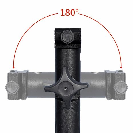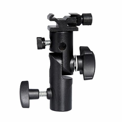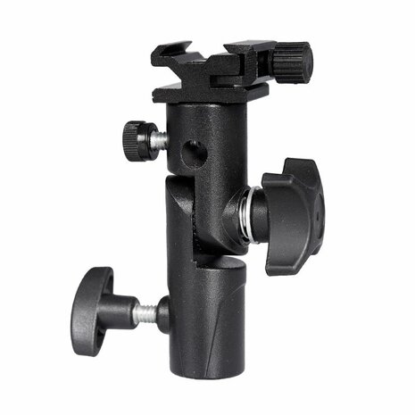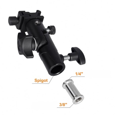 Bovenkant Voorzien van een hotshoe (female) aansluiting voor het aansluiten van accessoires zoals flitsers, lampen, monitors of microfoons met een hotshoe-aansluiting. Wanneer u de adapter losdraait, komt er een 1/4" (male) schroefdraad vrij. Dit biedt extra veelzijdigheid bij het bevestigen van diverse apparatuur of accessoires. Onderkant Aan de onderzijde beschikt de houder over een spigot-aansluiting, waarmee hij eenvoudig op een lampstatief kan worden bevestigd. De spigot kan vast- of losgedraaid worden met de zijdelingse draaiknop voor een snelle en veilige installatie. Daarnaast wordt een spigot-adapter meegeleverd, zodat de onderkant ook kan worden voorzien van een 1/4" of 3/8" (female) schroefdraad, voor nog meer mogelijkheden met verschillende statieven en accessoires. Kantelbaar Mechanisme Met een kantelhoek van 180 graden biedt deze flitshouder flexibiliteit om uw flitser of accessoire naar wens te positioneren. De draaiknop aan de zijkant zorgt ervoor dat de gewenste positie veilig wordt vastgezet, wat bijdraagt aan precieze lichtinstelling en stabiliteit. Paraplu-aansluiting In het midden van de houder bevindt zich een opening (diameter 1 cm) voor de bevestiging van een flitsparaplu. De paraplu kan stevig vastgezet worden met een draaiknop aan de zijkant, zodat deze tijdens gebruik op zijn plaats blijft. Overige specificaties Materiaal: Aluminium en kunststof Kleur: Zwart