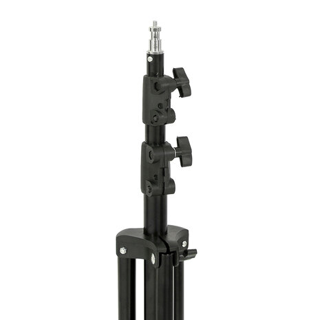 Dit lampstatief met zwenkwielen is de perfecte keuze voor gebruik van uw studioflitsers en speedlite flitsers. Het lampstatief is in hoogte verstelbaar, met een flexibele werkhoogte van 110 cm tot 240 cm. Veerdemping Het in hoogte verstelbare lampstatief bestaat uit secties met veerdemping, Deze interne veer dempt de val van de secties wanneer de vergrendeling wordt losgelaten, waardoor het risico op beschadiging wordt verminderd. Een veerdemping budgetvriendelijker dan luchtdrukdemping. Aansluitingen Aan de bovenkant is het lampstatief voorzien van een spigotaansluiting, inclusief een 1/4" schroefdraad, waardoor u gemakkelijk uw lamp of flitser kunt bevestigen. Dit maakt het statief geschikt voor een breed scala aan verlichtingsapparatuur. Naast het gebruik als lampstatief, kan dit statief ook dienen als basis voor een achtergrondsysteem of als reflectorhouder. Specificaties Maximale hoogte: 240 cm Minimale hoogte: 110 cm Lengte opgevouwen: 90 cm Maximaal draagvermogen: 6 kg Materiaal: Aluminium Gewicht: 1,6 kg