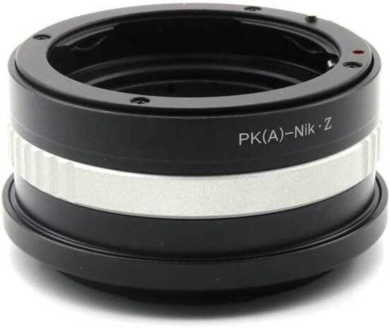 Body naar lens adapter Deze Lens Mount Adapter maakt het mogelijk om objectieven met een Pentax K (PK) aansluiting op een Nikon Z Body te gebruiken. Bevestiging Camera vatting: Nikon Z Objectief vatting: Pentax K De werking van alle automatische diafragma, auto focus en andere functies vervallen bij gebruik van deze converter.